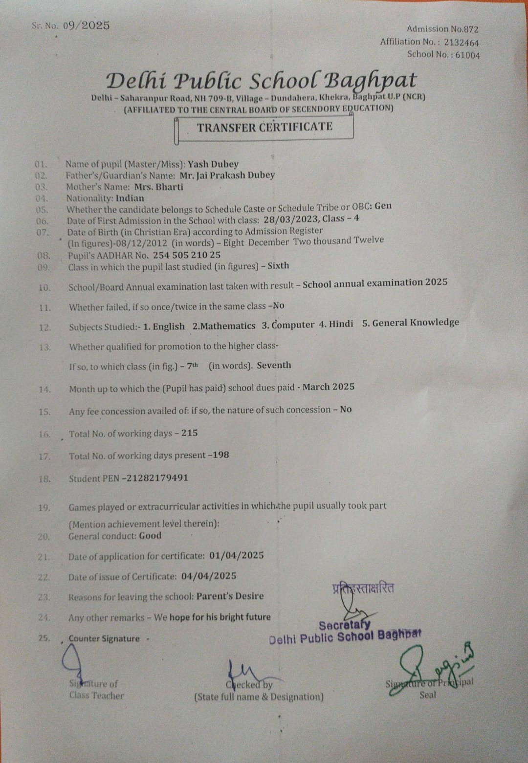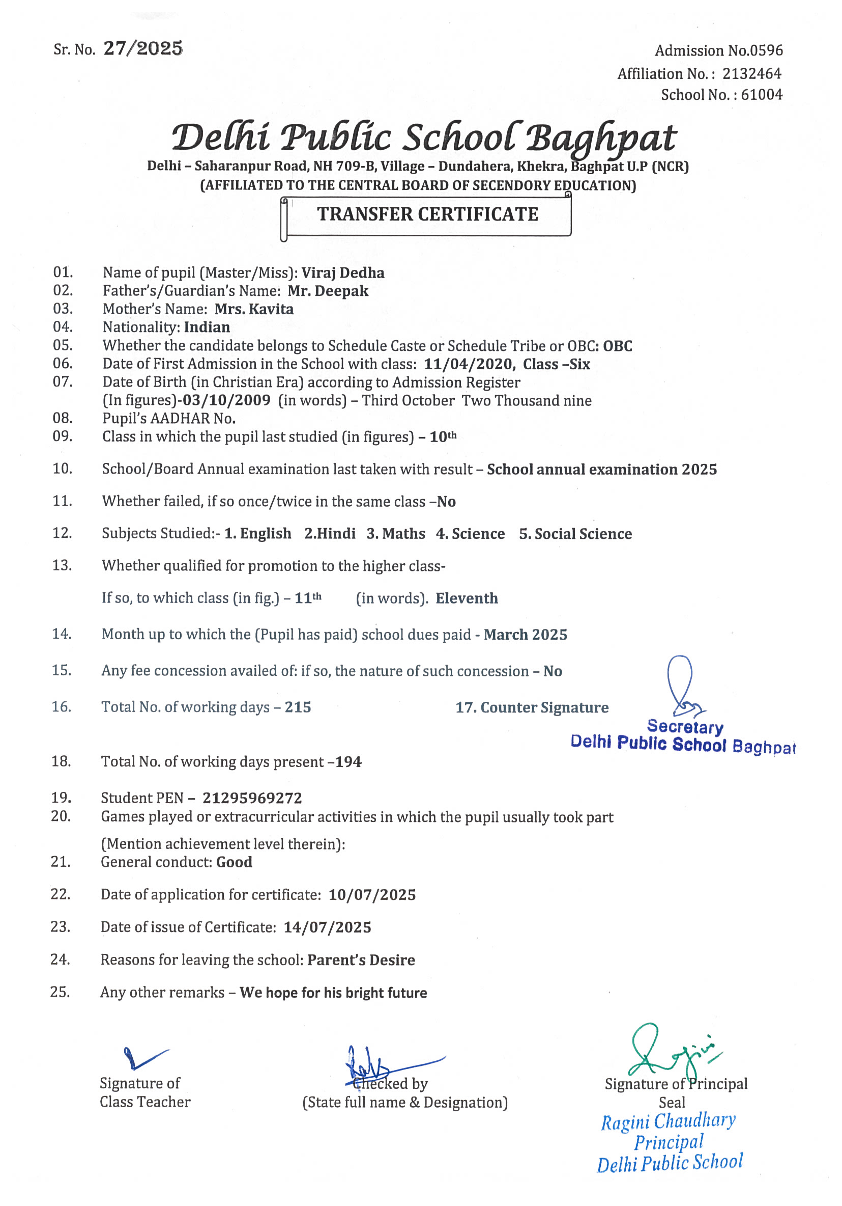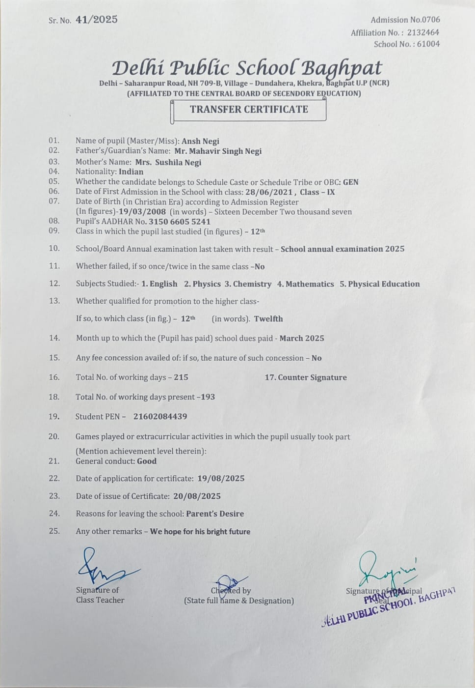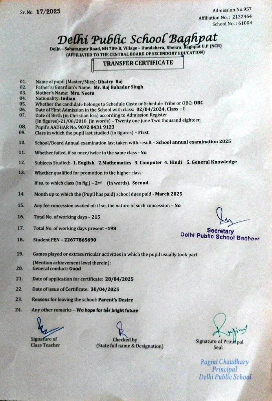 Transfer Certificate
