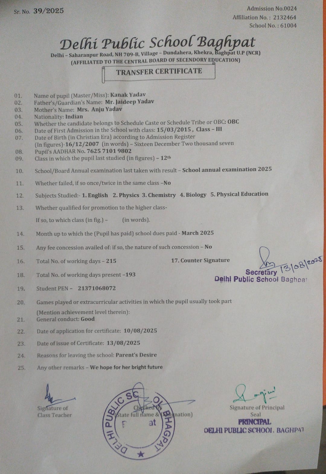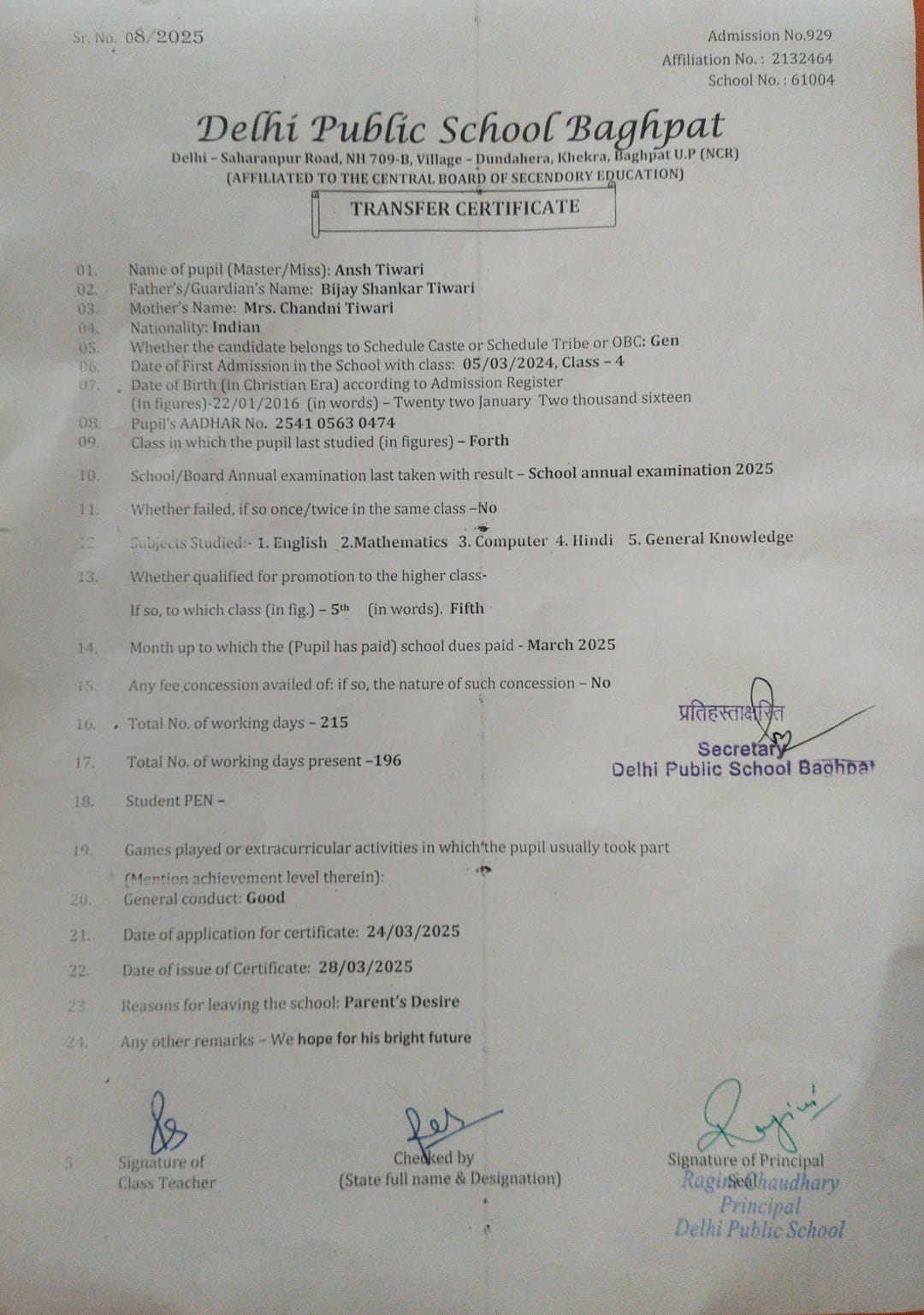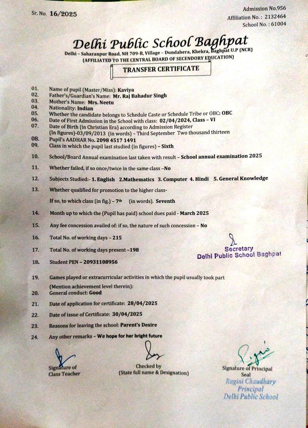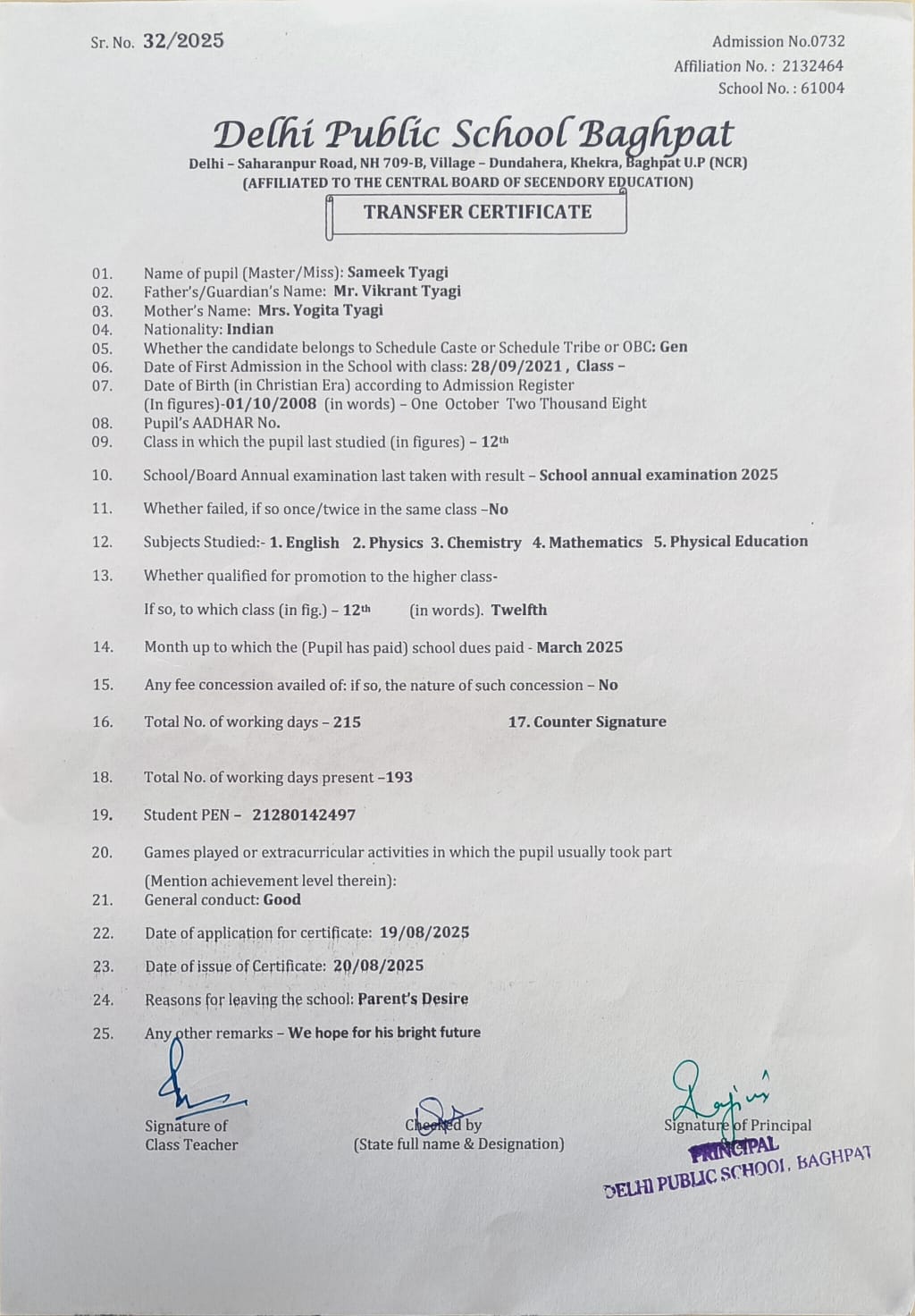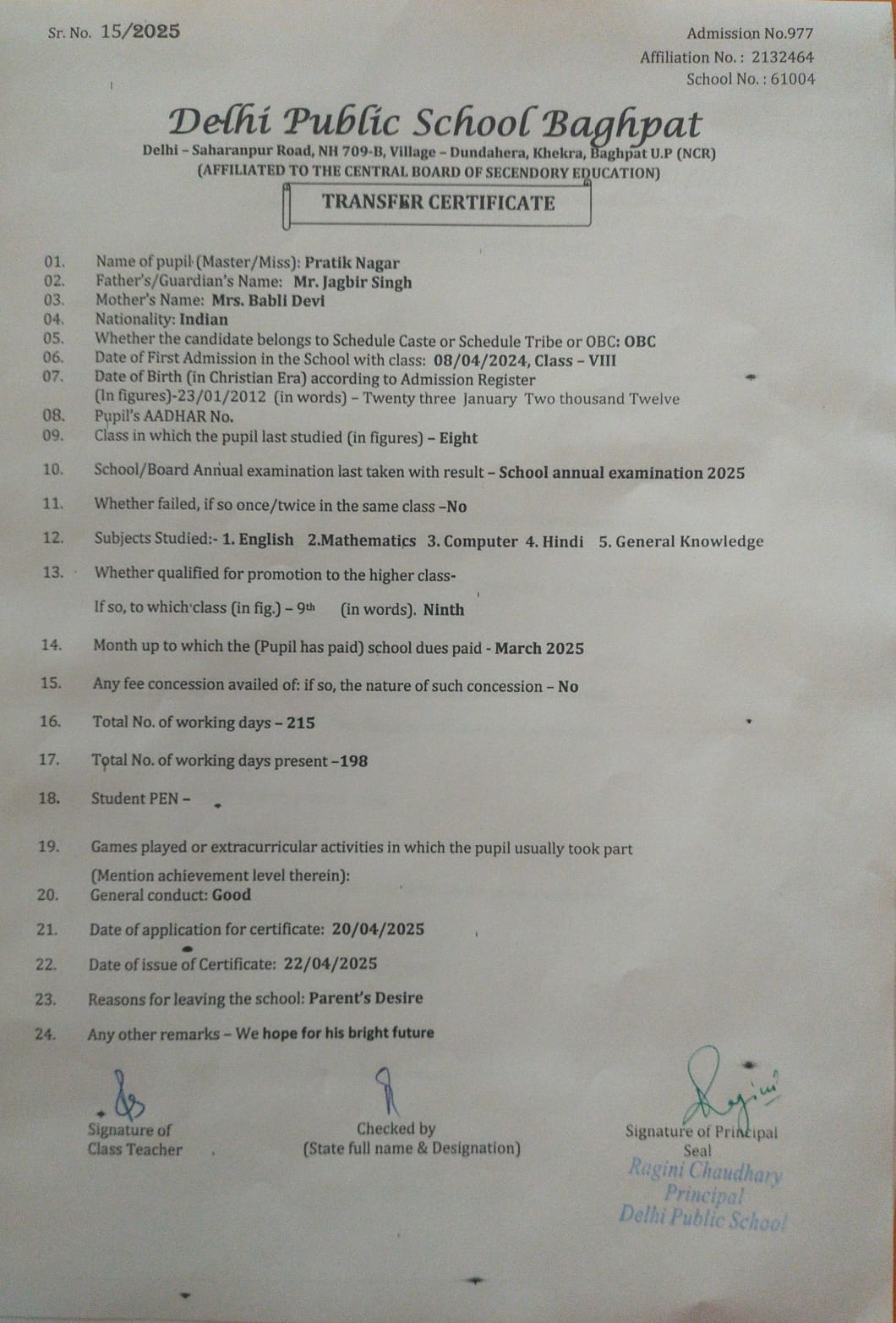 Transfer Certificate